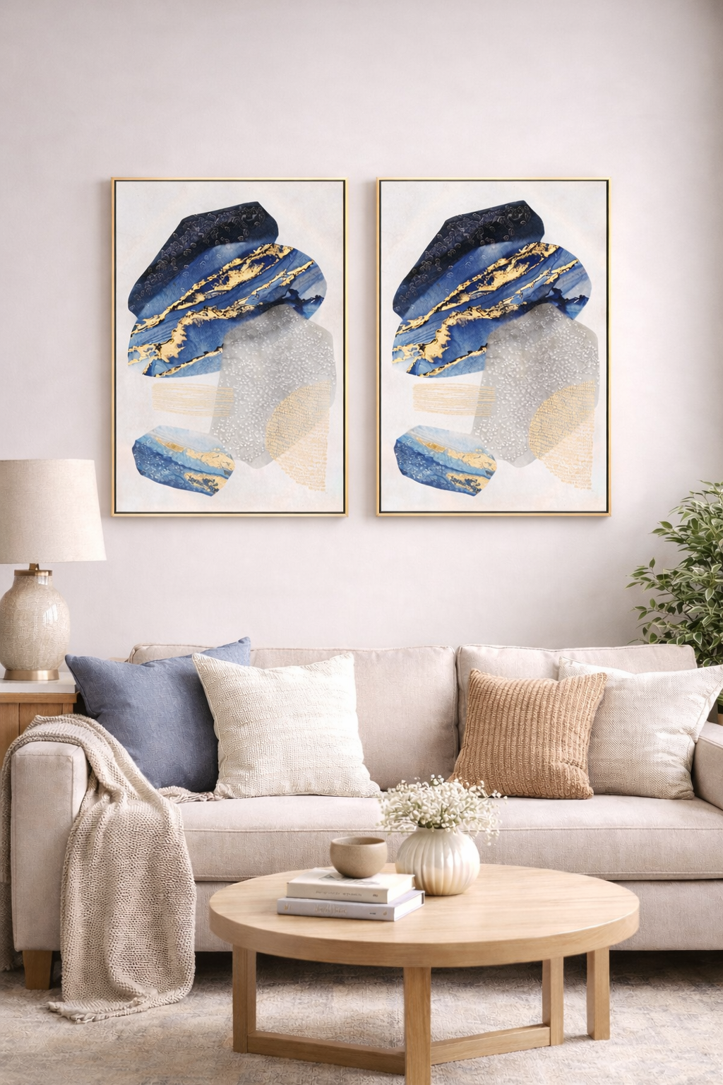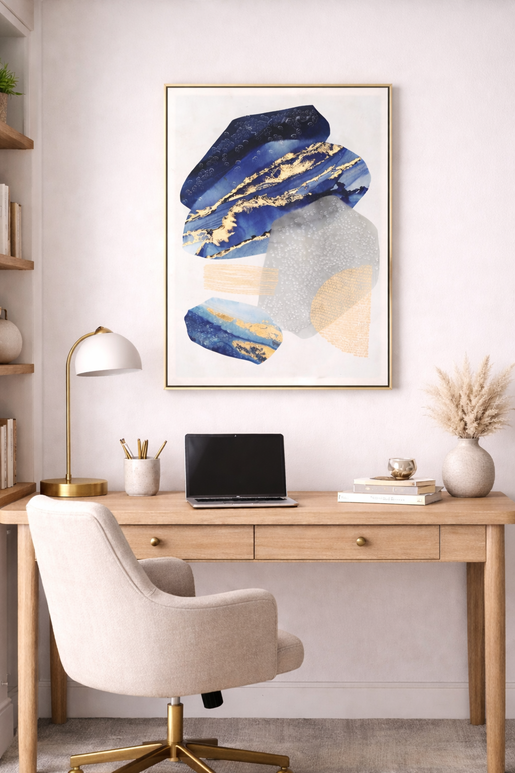 - Abstract Art Design with Gold Accents: Deep blues, soft greys, and gold detailing create a rich, layered look that adds depth, movement, and a premium feel to your space